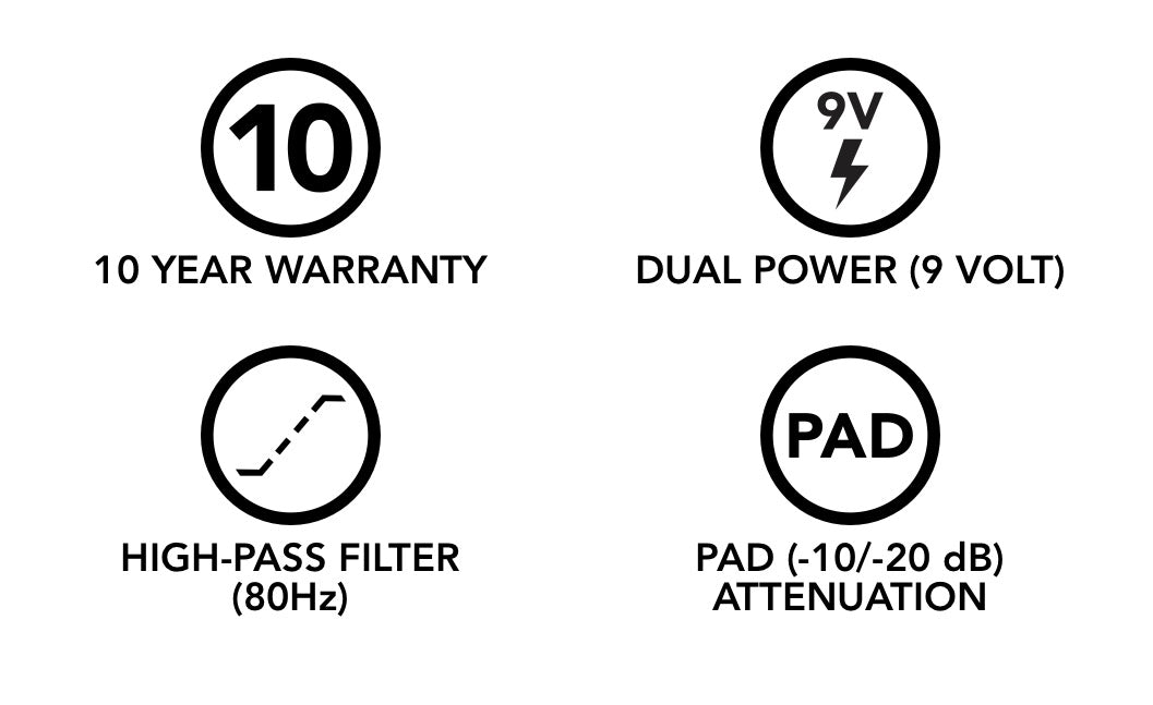 • Selectable pad (-10dB, -20dB) and high-pass filter (80Hz)